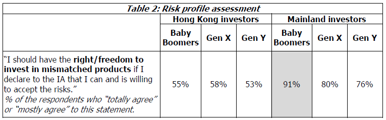 内地投资者更愿意投资于错配产品,82%表示他们应该有这样的权利。婴儿潮一代特别拥有这样的看法。 (表2)